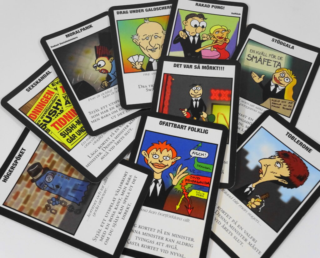 När jag tittar på korten så märks också att spelet är väldigt tydligt före internet. Kanske inte före internet som uppfinning, men innan IS, Genusvetenskap och Donald Trump. Och givetvis klimatfrågan. Tonen i det offentliga samtalet har idag blivit så rå och frågorna så fullständigt absurda att de är svåra att göra satir om. Går det ens att skämta om människor som skryter om att deras bilar skitar ner? Eller incells eller folk som tycker att klimatet är en åsikt. Det tycker jag är svårt. Och om vi (som vi var noga med då) verkligen ansträngde oss för att reta ALLA, hur många varningstexter skulle vi behöva på kartongen? Och vem skulle först hänga ut oss som -ister eller -fober med namn och adress på något forum? Jag har nog problem med konstiga reaktioner på mina böcker för att dessutom göra något sånt här idag. Och jag undviker politik och spel tillsammans. När jag ser det nu för tiden så går jag någon annanstans. För det är så uppenbart någons propaganda. Det var något som vårt spel aldrig var.”